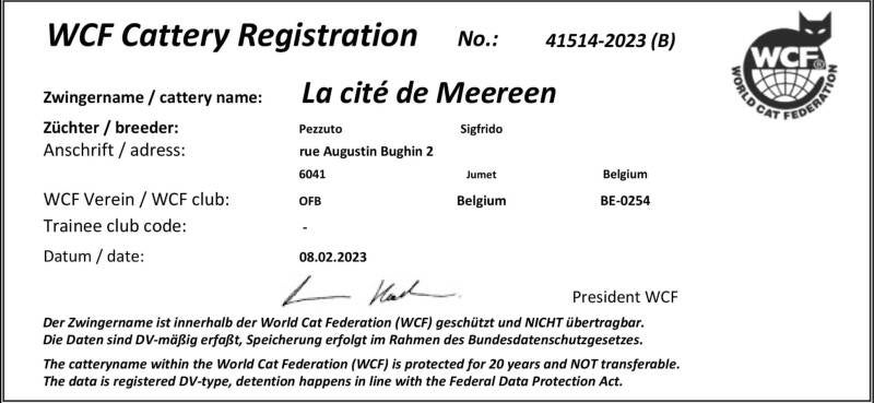 Nous sommes fièrement membres du club félin OFB (Organisation Féline Belge), qui nous délivre les pedigrees officiels de nos chatons ainsi que les titres d’exposition obtenus par nos chats. Par ailleurs, notre chatterie est reconnue par la World Cat Federation (WCF).